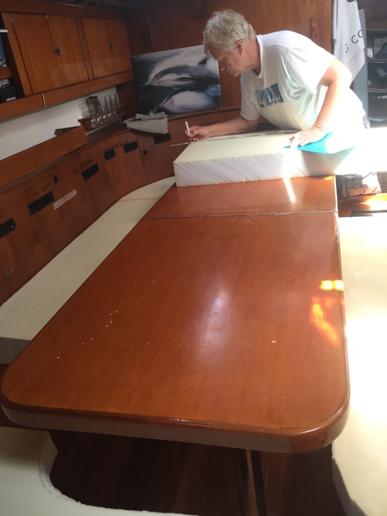 När det gäller dynorna i salongen är det faktiskt klart redan. Det var ett av Lucinas vinterprojekt medan regnet strilade på vår täta båt. Även om det var ett lågbudgetprojekt så blev resultatet lysande, mycket beroende på Lucinas syexpertis och utvecklande av kunskaper i tillskärning och limning i skumgummi. Lågbudget blev det förutom att arbetet gjordes ombord också för att vi hittade dynorna i en av grovsoprummen på varvet. Vi tror det var en felbeställning eller att en ägare tyckte madrasserna var för hårda. De var helt nya och förutom en hörna där man börjat skära i madrasserna var de intakta. Vi ville ha hårdare madrasser så det passade oss perfekt.