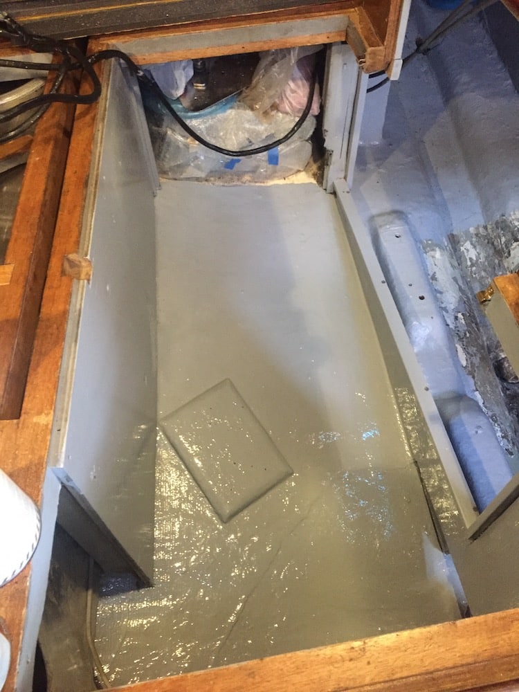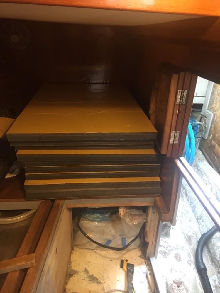 Så det känns skönt att vi nu tagit bort den dåliga plasten och det korroderade aluminiumröret som nu ska ersättas av ett rostfritt rör som med hjälp av epoxi sätts på plats för att sen plastas in. Problemet är dock att röret måste specialtillverkas och det är lång väntelista på rostfria arbeten (varvets tekniska avdelning har högsäsong med alla båtar som skall fixas innan sjösättning). Men vi har tålamod och inte bråttom, det viktiga är att det blir bra gjort. Under tiden har Lucina skurit till 29 st orätvinkliga nya isoleringsskivor till motorrummet som skall limmas på plats och jag har gjort rent kölsvinet under motorn som nu är nymålat. Lucina har sågat upp ett större hål på sidan i motorrummet med lucka för att komma åt motorn bättre och sågat till och monterat 11 nya lister. Av bara farten så har vi fortsatt akterut till stuvutrymmen där som nu är rengjort och nymålat. Sen har vi rensat bort många gamla dieselledningar, slangar och elkablar som inte används till något, slutat i tomma intet i bägge ändar (troligen kvar sen borttagen utrustning som värmare och generator?).