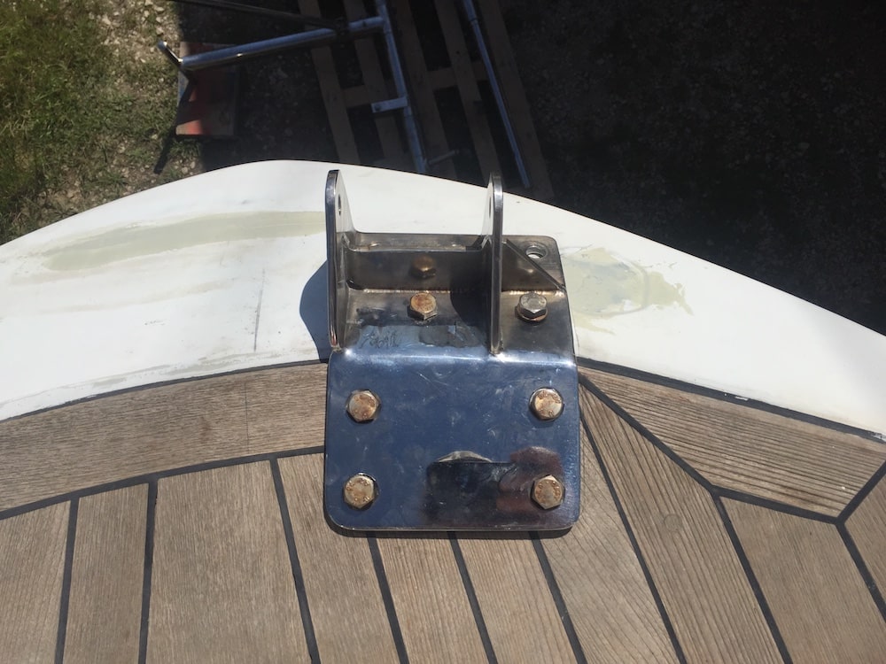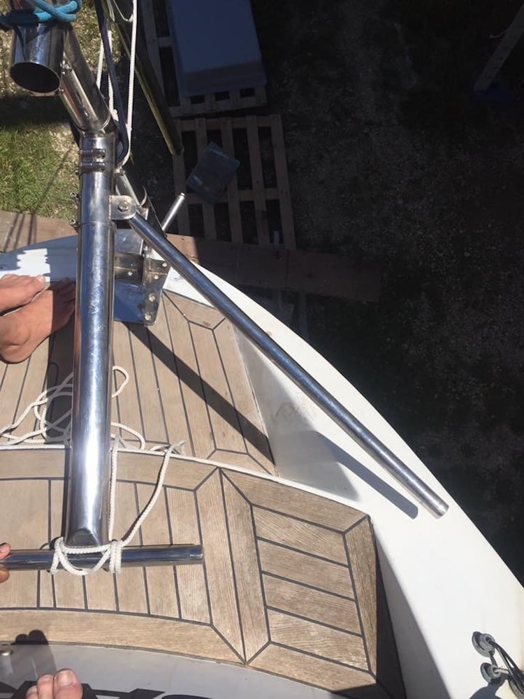 Vindrodret har tre fästpunkter som alla kräver genomgående bultar med hållplattor på insidan som skall passa till bultarna. Det är lite läskigt att borra håll i aktern på Sarita så vi har hissat upp vindrodret ett par gånger och fixerat det på plats med ett spindelnät av linor. Vad vi kommit underfund med är att vår akter skiljer sig lite från en Grand Soleils vilket innebär att vi får anpassa våra fästen en aning. Dessutom har vi känt att det nedre fästet som ”bara” haft en vertikal platta, behövts förstärkas med en horisontal del för att minska trycket på bultarna. Så det har vi låtit svetsa på. Men skillnaderna i aktern gör också att vi är tvungna att vinkla det nedre fästet en aning, men efter lite konsultation på nätet bland kunniga seglare tror vi inte det påverkar styrkan i konstruktionen nämnvärt. Så nu är hålen borrade, bultar inhandlade så processen med monteringen är startad.