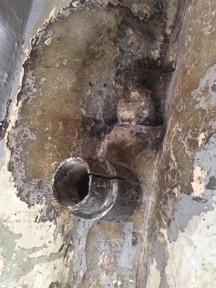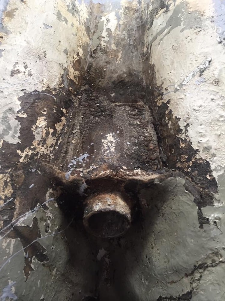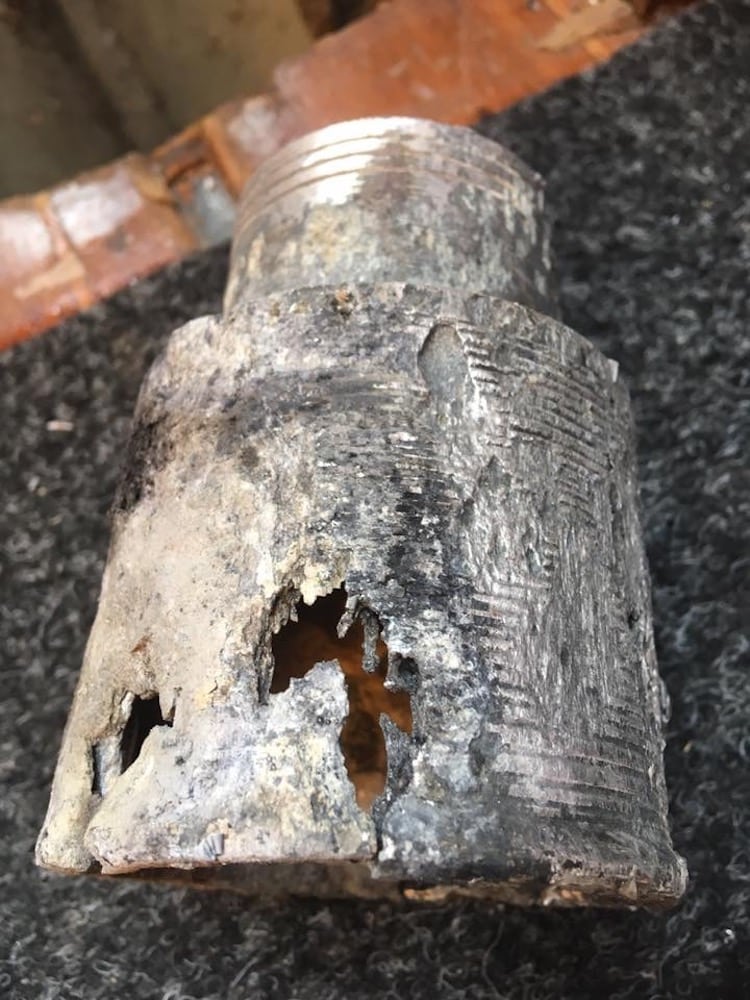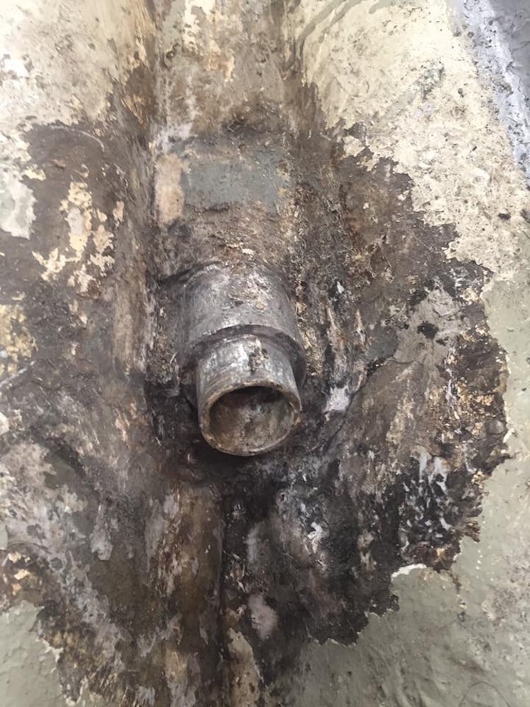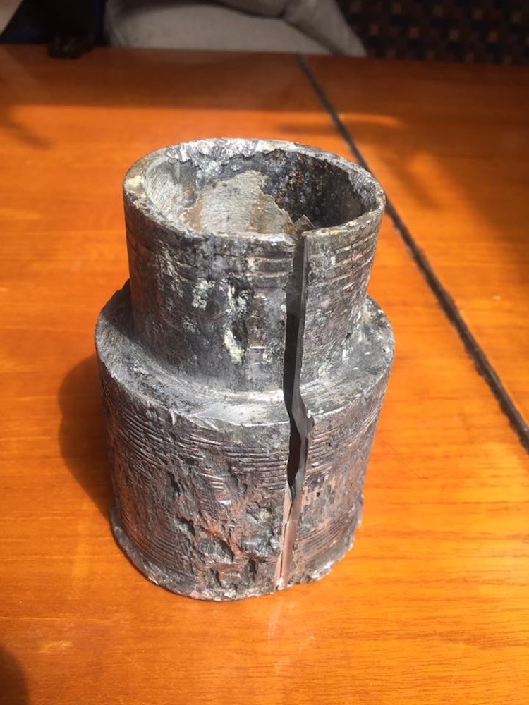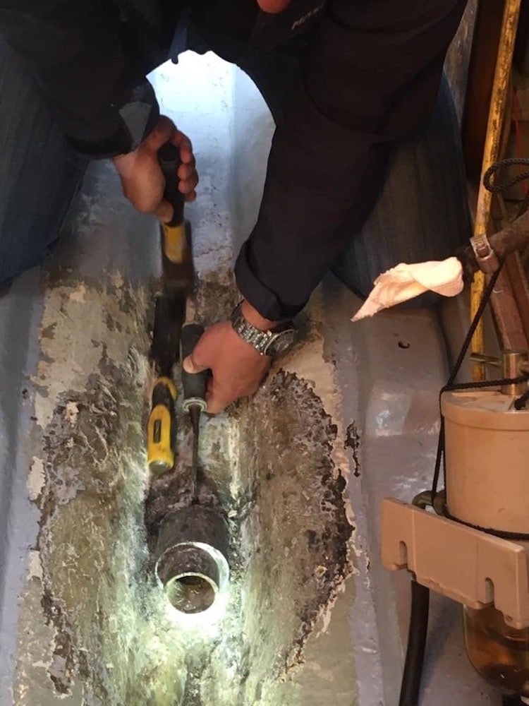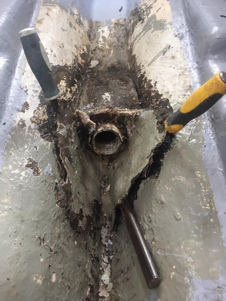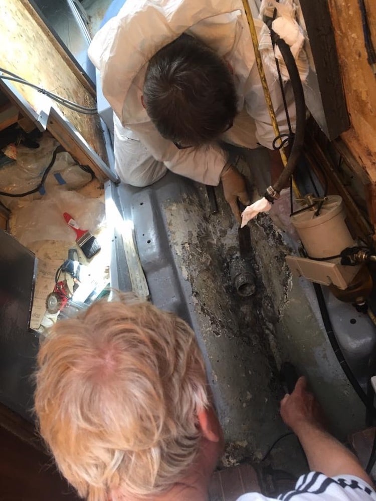 Men det är vad som är kvar i motorrummet som gett oss lite merjobb, eller mer nogräknat röret som propelleraxeln går igenom. Det avslutades med ett aluminiumrör som var fastsatt med sikaflex runt plaströret som går genom skrovet och sedan inplastad. Området runt aluminiumröret hade delaminerat och behövde plastas om så det var bara att hugga bort de dåliga laminaten. När vi exponerade aluminiumbiten så visade det sig att den var korroderad och till och med hade hål i sig. Med kombinationen delamineraing och hål i röret fanns det en risk för läckage direkt in i båten, och med allt beläget under motorn så hade det varit svårt att stoppa om vi befunnit oss mitt på havet.