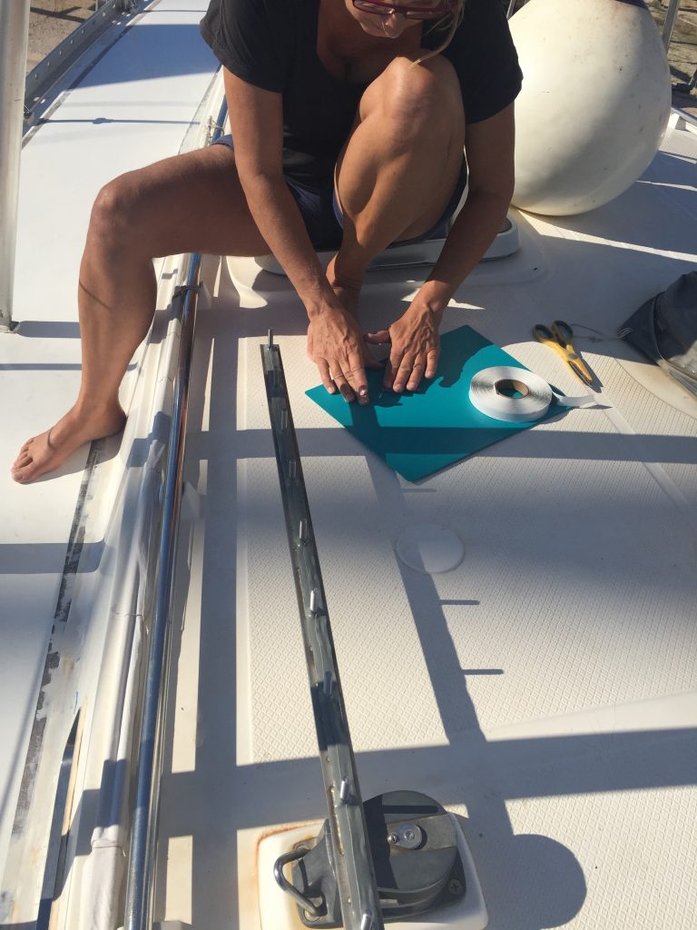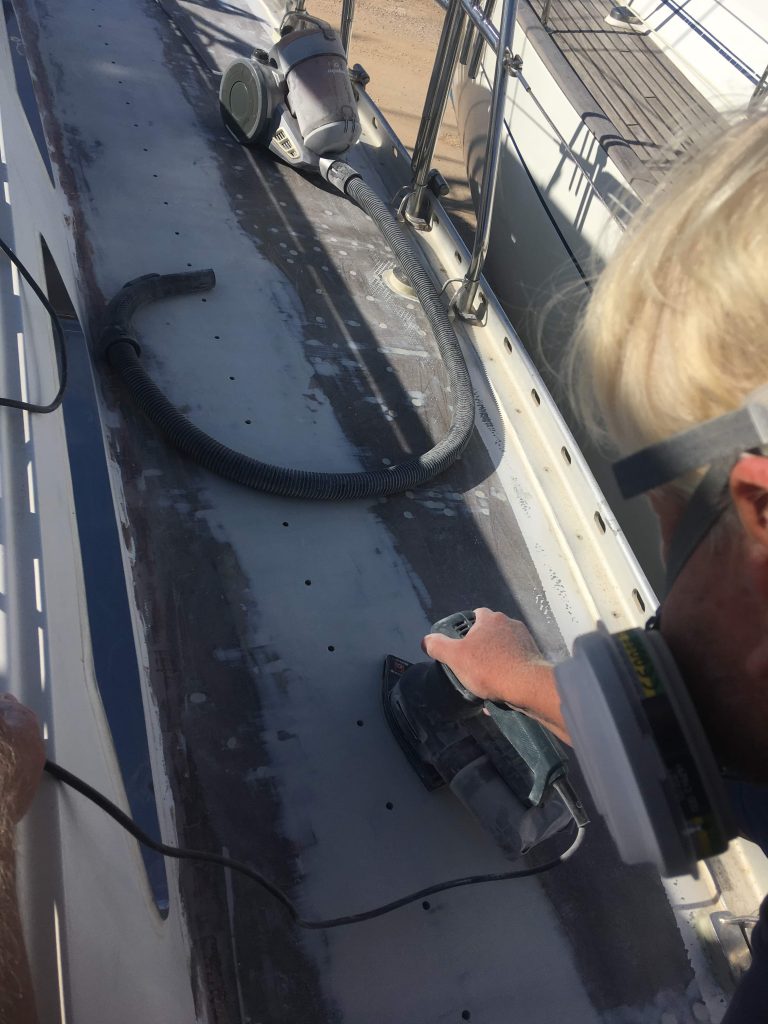 Det arbetet gjordes i våras och gick relativt smärtfritt eller så har vi förträngt hur besvärligt det var. Sen dess har all teak avlägsnats, epoxi och epoxi filler har lagts för att täcka de 3000 hålen vi borrat i skruvhålen och för att torka däcket, med slipningar och skrapningar mellan varven. Men för några veckor sedan tyckte vi delar av däcket var tillräckligt slätt för att måla med grundfärg (vi har valt De Ijssels färger efter lite marknadsundersökningar). Det var bland annat området runt skotskenorna som fick två lager med grundfärg just med tanke att vi ville få dit skenorna innan de värsta regnen under vintern skulle anlända. Hålen rakt igenom båten har alltid varit ett orosmoment när regnen faller, och det brukar smattrar på bra i de frontpassager som sker på höst/vinter/vår även i Joniska havet. Vi har tejpat över hålen och det har fungerat tillfredsställande men oron för läckage har alltid funnits där så att montera tillbaka skenorna låg högst på prioriteringslistan.