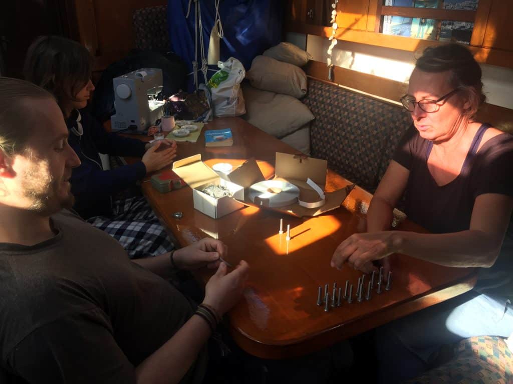 Vladimir och Lucina jobbar med att få bultarna genom mothållsskenan i akterhytten. Garderoben fick vi plocka isär för att komma åt alla bultar.