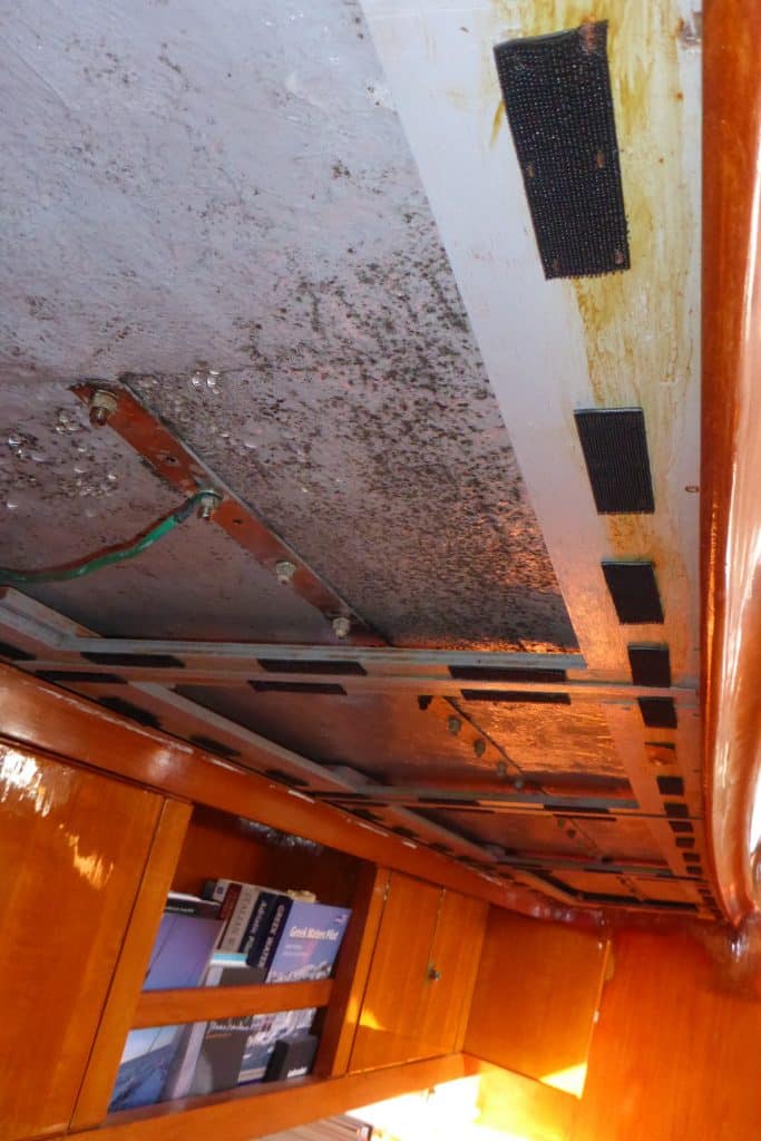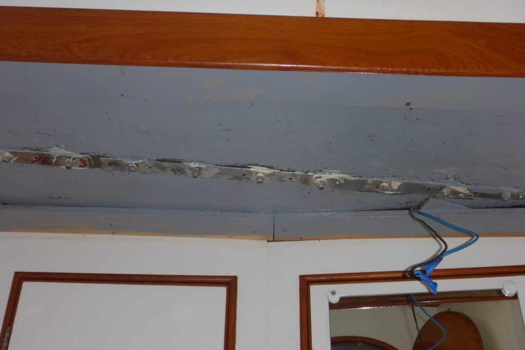 När vi beslöt att ta bort teaken på däck och måla däcket i stället så ingick det att montera bort skotskenorna. Det svåraste momentet då, och det som kändes mest smärtsamt, var att ta bort inredning för att komma åt alla muttrar under däck. Den enkla biten var att ta ner innertaket, det satt med kardborrband. Den smärtsamma delen var att såga i inredningen för att komma åt alla muttrar. Vi upptäckte att skotskenorna måste ha monterats innan inredningen byggdes då alla bultar var avkapade nedanför muttrarna (förmodligen med vinkelslip).