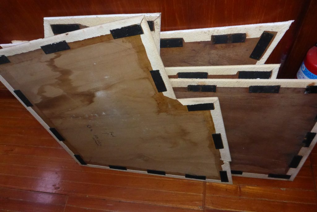Vi har nu legat på land i över ett år med olika projekt på båten (över 100 på arbetslistan) där borttagandet av teaken på däcket är det mest omfattande och det som står högst på prioriteringslistan. Vi har under många år haft läckor i båten och är vana med att balansera yoghurtburkar på omöjliga ställen då de kraftiga åskregnen har härjat. På land har vi sluppit oroat oss för att dragga men har under sex månader haft 90 hål rakt ner i båten vilket vållat oro och varit nästan lika ångestladdat som oron för att ankaret skall släppa när det blåst upp på natten.
