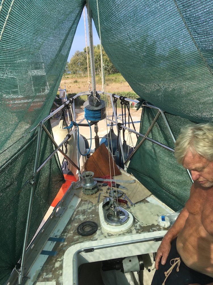 Så frustrationen av att inte kunna måla ökade under juni men då vi hade så mycket andra projekt beslöt vi oss för att lägga målningen på hyllan till hösten. Nu hoppas vi att sommarvärmen med ibland över 35 grader i ruffen inte påverkat färgerna vi har förvarade i ett skåp i Sarita, det skulle verkligen skapa frustration. Nu hoppas vi att det blir en höst med temperaturer på under 25 grader på dagen (vi har täckt in den största delen av Sarita med soltält) innan höstregnen och frontpassagerna börjar.