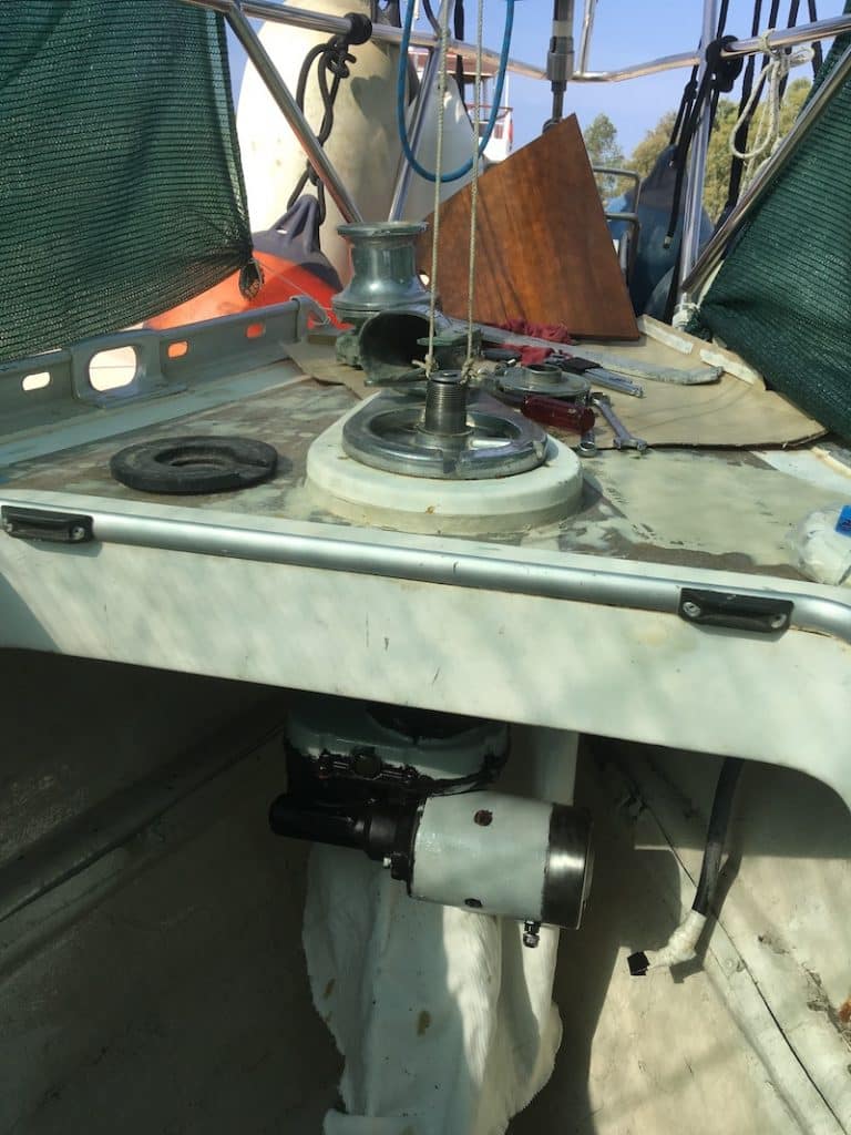 Vi började titta på nya ankarspel, även av andra billigare modeller men det kändes inte så motiverande då vi satsat på renoveringen. Det skulle bli dyrt även om det inte skulle bli samma kostnad som för en ny Maxwell. Men först beslöt vi att montera bort ankarvinschen för att se om vi kunde hitta läckan, den måste ändå bort om en ny skulle dit. Men med sikaflex så satt den riktigt hårt men med kofot fick vi loss den till slut och kunde få den till vår arbetsbänk under båten. Och där upptäckte vi läckan, något vi hade tänkt kontrollera innan men lite glömde bort när vi fick information om hur dåliga kanterna var och att läckan nog kom från den skarven. Det var nämligen så enkelt att påfyllningspluggen inte var åtdragen så det läckte vid packningen då oljan går lite över påfyllningshålet. Det var med blandade känslor vi konstaterade detta, vi kände oss dumma över att inte ha kontrollerat pluggen från början men samtidigt var det en lättnad att en merkostnad kunde undvikas. Så efter noggranna tester kunde vi konstatera att det inte fanns fler läckor har den renoverade ankarvinschen åter monteras till stor lättnad. Och hittills inga fler läckor.