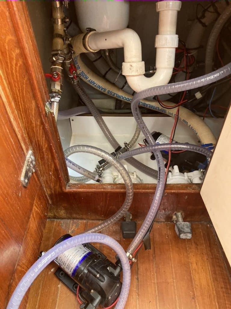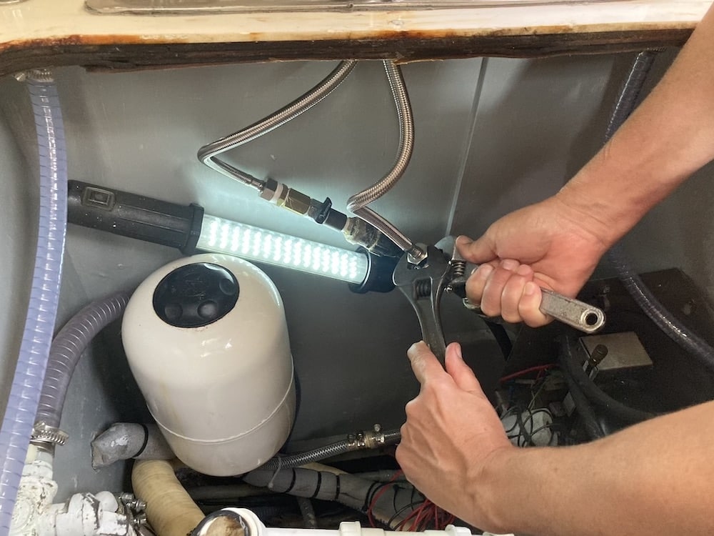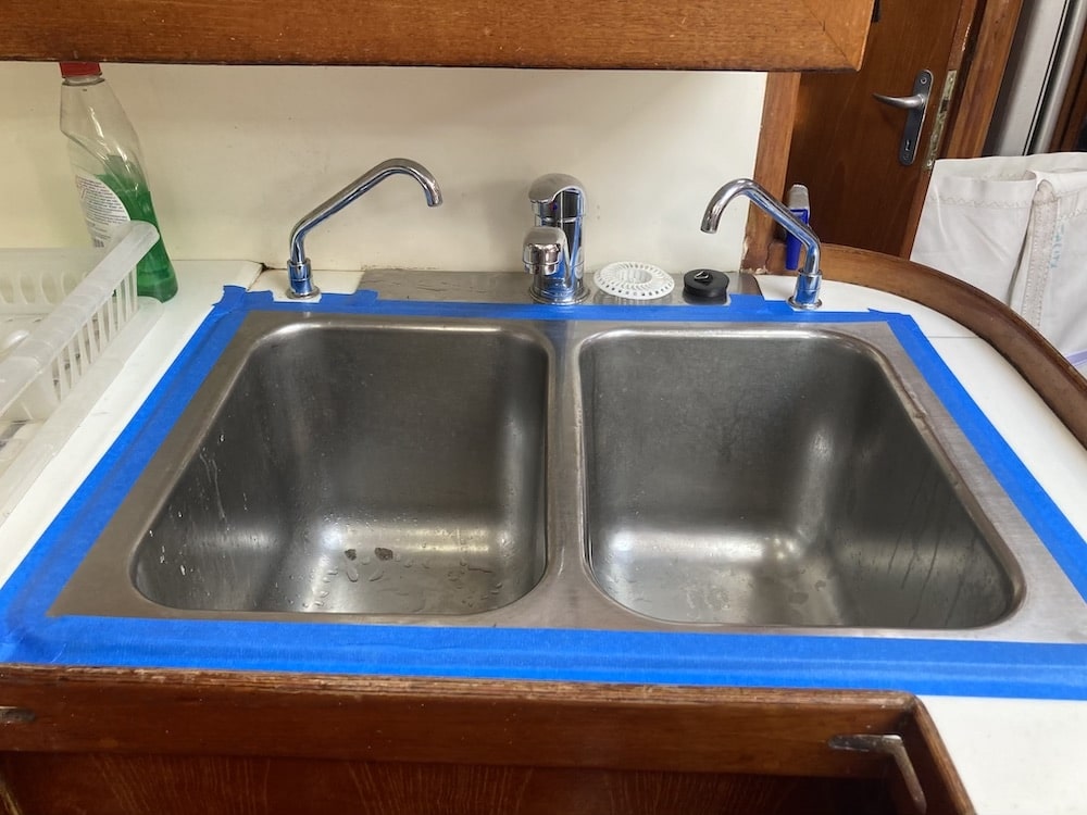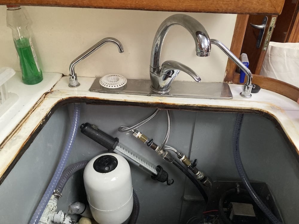 Men vi har inte bara målat botten och städat sen vi kom hit. Vi har också hunnit med att specialbeställa en motorlyft för utombordaren till jollen som vi installerat på däck. Nu kan man lyfta på den själv och utan att ryggen tar stryk. När vi kom ner till båten upptäckte vi att kranen i pentryt inte gick att rubba, så vi fick köpa en ny. Bra var då att vi inte satt fast diskhoarna ännu för vi vill veta om den vattenkylda kylen fungerar innan vi permanent sätter fast den, nu ligger den fixerad med tejp. Så det var bara att lyfta bort och montera den nya kranen. Men nu känns det som vi gjort alla de projekt vi planerade innan sjösättning så Sarita känns redo.