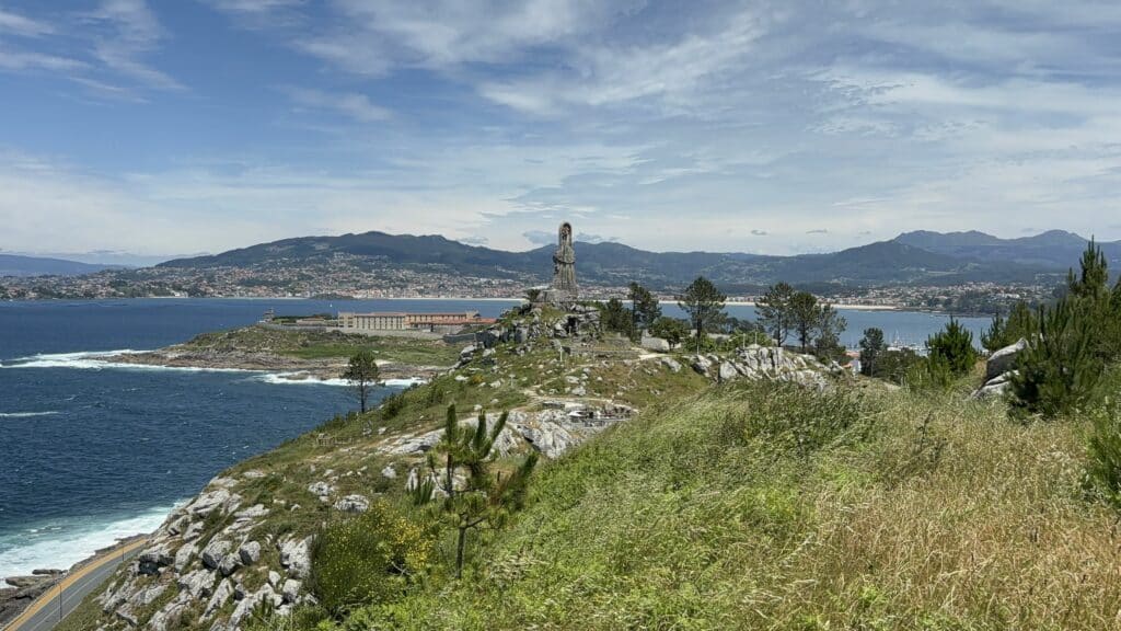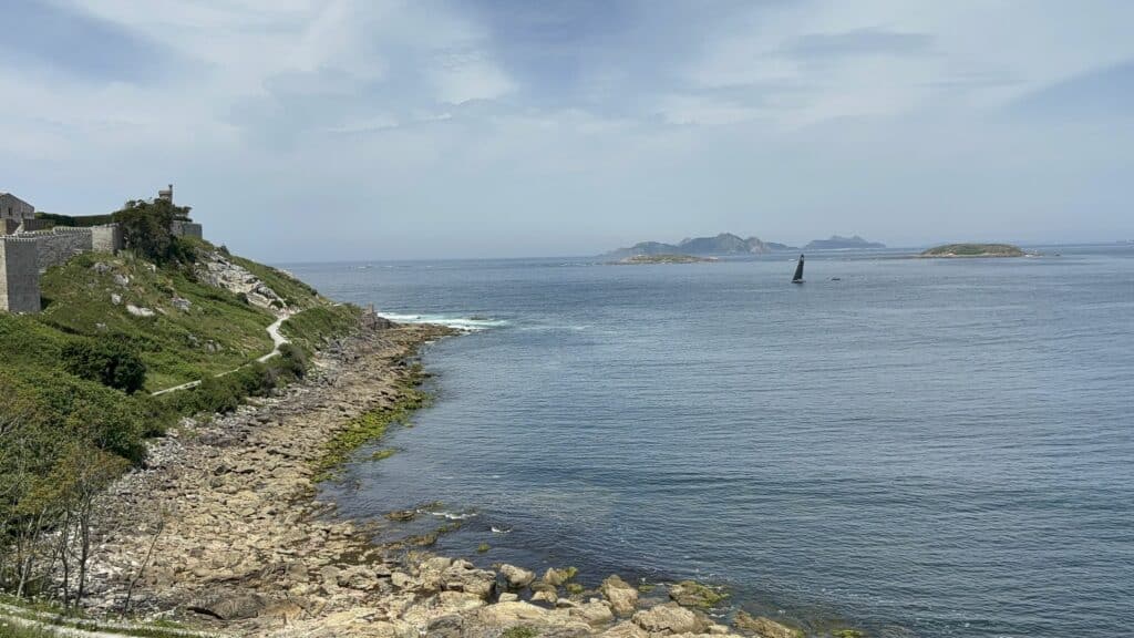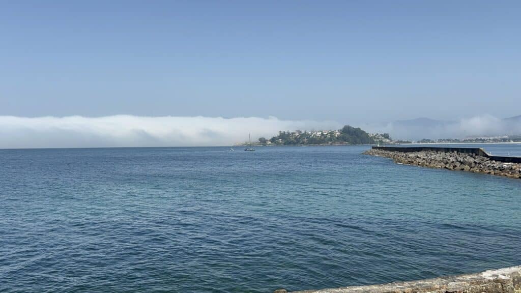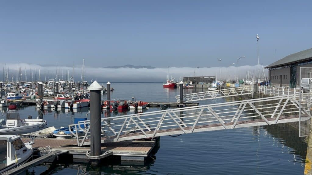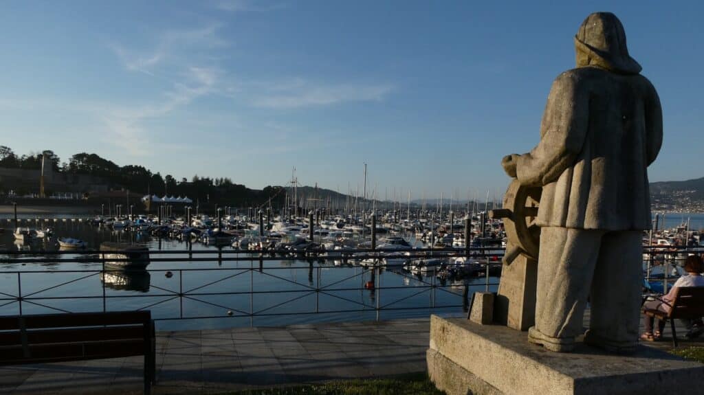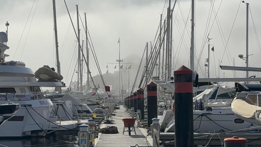 Baiona är en riktig turistattraktion, vilket är förståeligt då staden, förutom vad som nämnts ovan, ligger skyddat innanför en halvö med Atlanten utanför som en ständig följeslagare. Det finns öar inåt “Ria de Vigo” och söderut kunde man skönja uddarna vi skulle runda på vägen söderut. Staden har mycket konstverk spridda runt promenadvägarna som ofta går längs kusten, eller på ringmuren. Där finns olika små och stora stränder, en del med små stenbassänger när tidvattnet drar sig tillbaka. Det finns en kommunal idrottsplats där ungdomar samlas och spelar fotboll och basket och i själva staden sjuder det av liv i gränderna på kvällen när tavernorna och kaféerna öppnar. Så det blev en hel del promenader och vandringar, bland annat upp till Jungfru Maria statyn mitt emot fortet och längs strandpromenaden. Under en av promenaderna runt ringmuren såg jag en dimbank ute till havs som sakta rörde sig in mot Baiona. Det var fascinerande att se hur den närmade sig och förvandlade allt till ett töcken när den svalde område efter område. När den anlände till marinan kändes fukten i luften och temperaturen sjönk drastiskt, och sikten försvann.