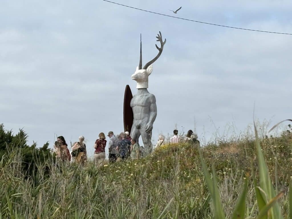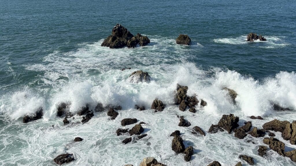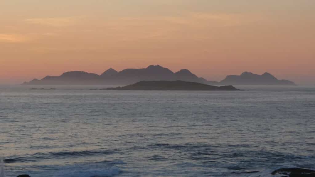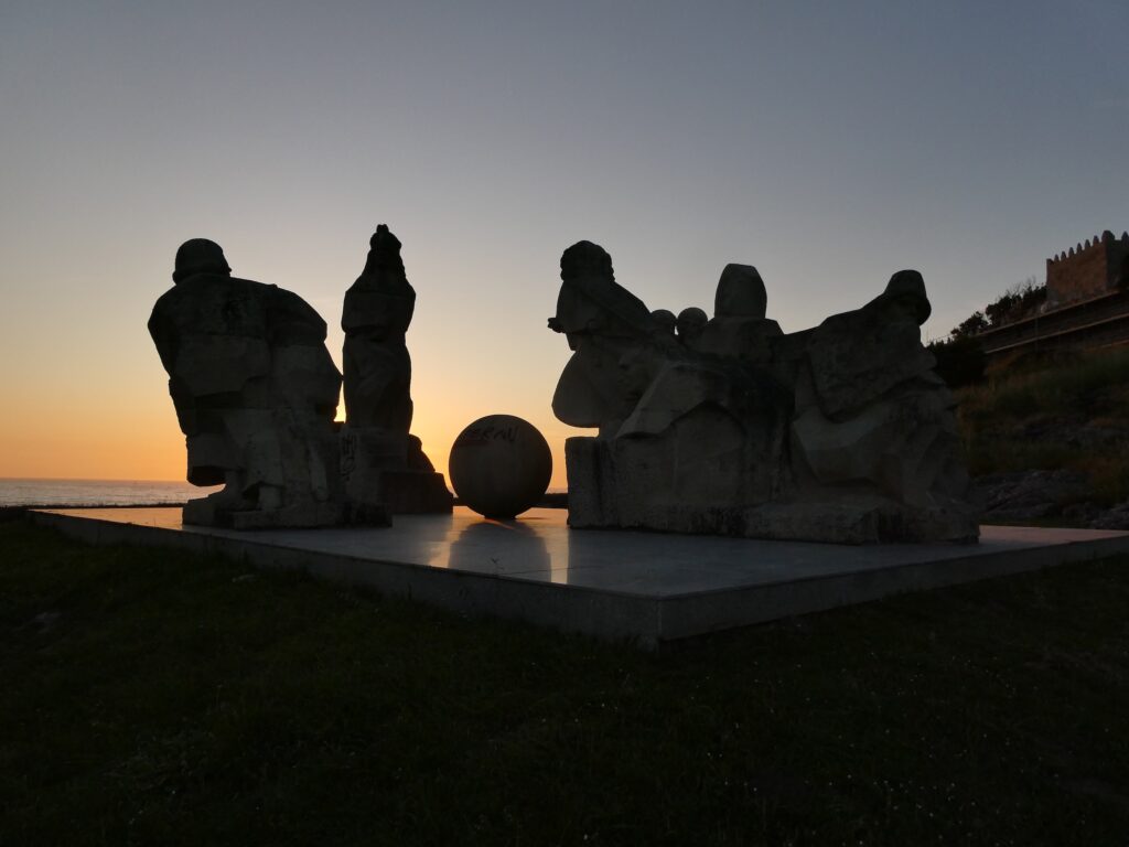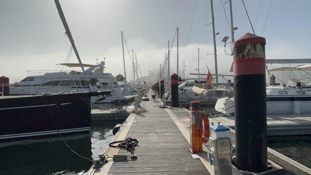 Baiona är en riktig turistattraktion, vilket är förståeligt då staden, förutom vad som nämnts ovan, ligger skyddat innanför en halvö med Atlanten utanför som en ständig följeslagare. Det finns öar inåt “Ria de Vigo” och söderut kunde man skönja uddarna vi skulle runda på vägen söderut. Staden har mycket konstverk spridda runt promenadvägarna som ofta går längs kusten, eller på ringmuren. Där finns olika små och stora stränder, en del med små stenbassänger när tidvattnet drar sig tillbaka. Det finns en kommunal idrottsplats där ungdomar samlas och spelar fotboll och basket och i själva staden sjuder det av liv i gränderna på kvällen när tavernorna och kaféerna öppnar. Så det blev en hel del promenader och vandringar, bland annat upp till Jungfru Maria statyn mitt emot fortet och längs strandpromenaden. Under en av promenaderna runt ringmuren såg jag en dimbank ute till havs som sakta rörde sig in mot Baiona. Det var fascinerande att se hur den närmade sig och förvandlade allt till ett töcken när den svalde område efter område. När den anlände till marinan kändes fukten i luften och temperaturen sjönk drastiskt, och sikten försvann.