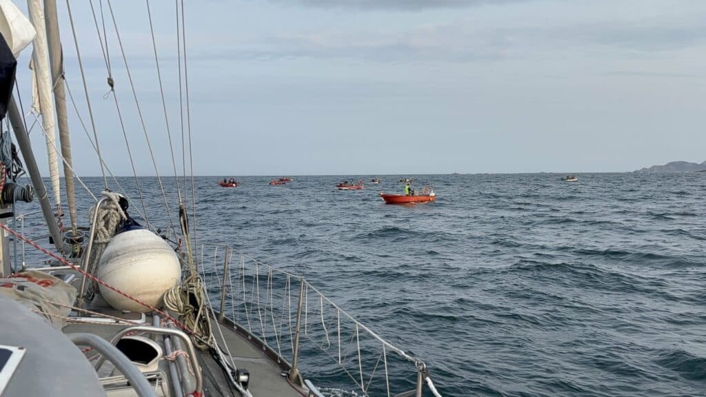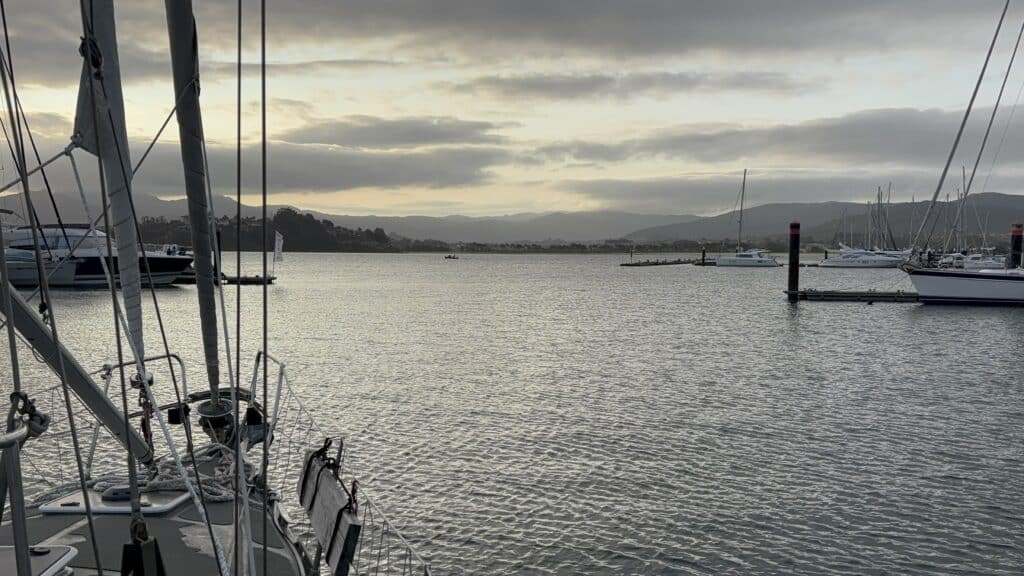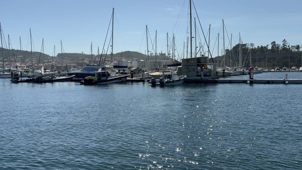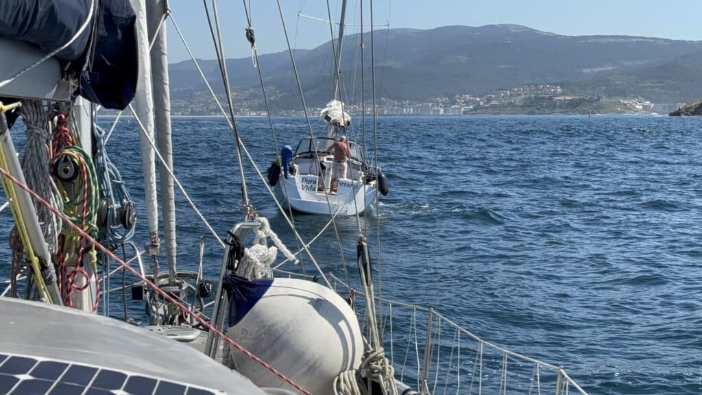 Den portugisiska nordan blåste fortfarande, men inte speciellt hårt så det blev motorsegling halva sträckan med revad stor för stabilitet i dyningarna och delvis utrullad genua för att hjälpa till med farten. Motorn brummade på utan problem och den började långsamt att återskapa förtroendet hos oss. På vägen bytte vi artighetsflagg från den gulröda spanska till den rödgröna portugisiska. Vid rians mynning passerade vi ankrade fraktbåtar som väntade på att gå in till Vigo och under färden passerade vi fiskebåtar, TP 52 segelbåtar ute på övning, en konstig boj, fiskeredskap, några segelbåtar och lite annat smått och gott. Den konstiga bojen, som var av det gigantiska slaget, gissade vi var någon sorts väderstation. Vi noterade att längs den portugisiska Atlantkusten var det mestadels en lång sandstrand och långt mellan bebyggelsen som oftast låg i anslutning till en flodmynning, eller en vacker sandstrand med hotell.