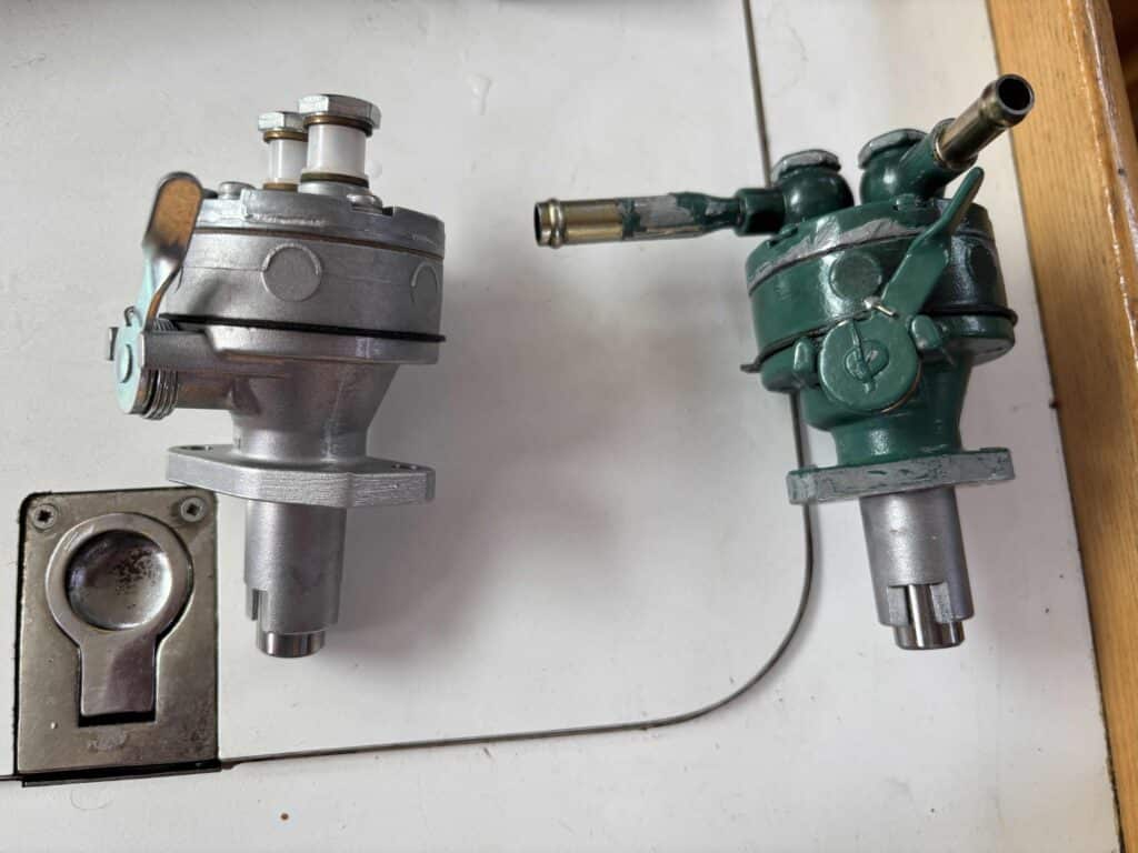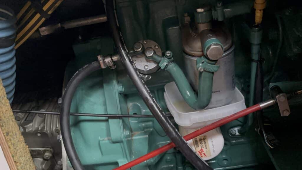 Under tiden vi väntade på matarpumpen gjorde vi en grundligare felsökning om det kunde vara något stopp eller luftläckage i bränsleledningen, det kunde finnas en anledning till att matarpumpen gått sönder. Då upptäckte vi, under ett förvaringsutrymme i förpiken, att mellan tanken och förfiltret hade en handbränslepump installerats, en sån som man har till utombordaren på bensinslangen från en extern tank. Den var nog ditsatt för att kunna pumpa in diesel i förfiltret efter man tömt den på innehållet och bytt filter. När vi testade den så var den trög men efter några pumptag så gick den lättare. Det kunde vara den som orsakat problemet med att matarpumpen. Det fanns en handbränslepump i reserv ombord så om det fortsatt var problem med matarpumpen så visste vi vad vi skulle åtgärda. När väl matarpumpen till motorn kom, efter nästan en vecka, så gick den snabbt att installera och motorn kunde åter startas. Nu brummade den förtroendegivande igen så vi kände oss säkra på att problemet var åtgärdat även om vi var mycket vaksamma på förändringar i motorljudet under den kommande tiden.