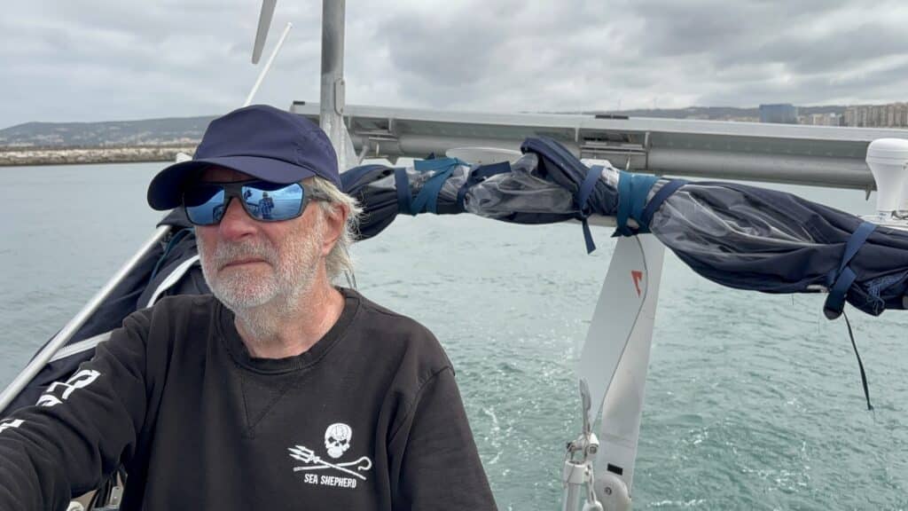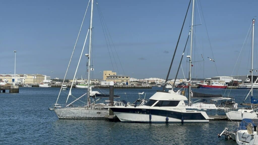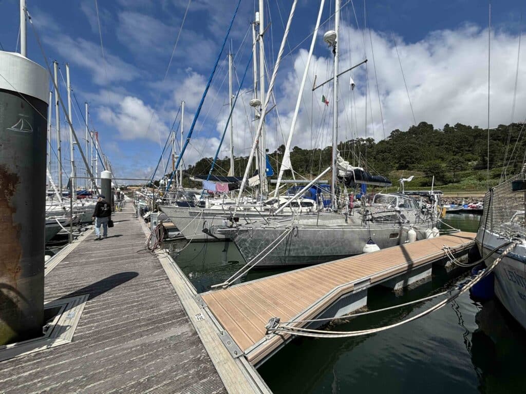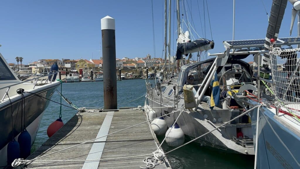 När vi tagit ner seglet och närmade oss hamnen insåg vi att Peniche inte hade en lika utvecklad turistnäring som sin nära granne Nazaré utan var mer en fiskhamn. Gästplatserna i marinan bestod endast av en flytbrygga utan bommar så båtarna låg längsmed och när vi kom var alla platser upptagna. Vi förberedde att lägga oss utanför en franskflaggad segelbåt med ljusblått glänsande skrov, men dess besättning kom genast upp på däck och viftade bort oss. Det fanns en liten bit av bryggan framför deras båt som de insisterade på att vi skulle lägga oss vid. Så vi förtöjde framför fransmännen med Ikigais för som stack ut en bra bit utanför bryggan, men det fungerade. Senare kom fler båtar som la sig utanför båtarna på gästbryggan, dock inte utanför den franska blåa båten.