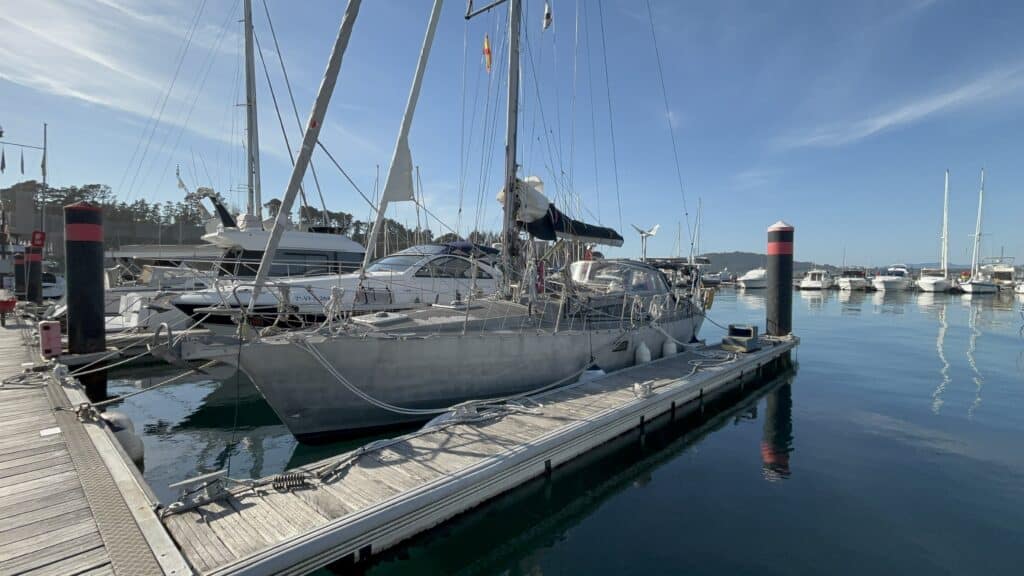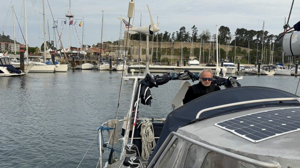 Vinden var fortfarande nästan obefintlig och tidvattnet sköt oss sakta mot klipporna i lä om oss så nästa utmaning var att få bogsering. Vi lyckades till slut få lift av en passerande segelbåt som var på väg till Baiona lite längre ut i bukten (“rian”). Under bogseringen kontaktade vi en av marinorna där, Monte Real Club de Yates, så när vi kom in till Baiona mötte marineros från marinan och bogserade oss in den sista biten till vår förtöjningsplats. När Tompa checkade in på marinan så passade han på att beställa en my matarpump till vår Volvo Penta motor, vilken de trodde att det skulle vara upp till en veckas leveranstid på. Vi gjorde ett försök att plocka isär matarpumpen för att se om den gick att renovera utan reservdelar, men det fungerade inte så vi fick vackert vänta på en ny.