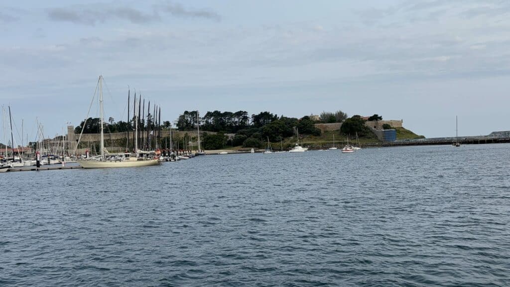 Så i gryningen den 3:e juni styrde vi ut mot havet igen från Spanien med sikte på Portugal. Efter veckan i Baiona hade vi lite tidsbrist då vi såg att ett lågtryck skulle bildas på Iberiska halvön inom en vecka och ge ostadigt väder och motvind. Så vi siktade på en lång dagsetapp på 60 NM söderut till Porto, men det fanns en tre fyra ställen där vi kunde stanna över natten på vägen om vi skulle vilja. Utanför vågbrytaren möttes vi av dyning som vanligt, men också av ett gäng små ankrade fiskebåtar som höll till på grundflaket utanför piren. De blockerade nästan vägen men vi hittade en lucka, fiskebåtar tar inte någon hänsyn till nöjestrafiken i de här trakterna. Vi kunde se det imponerande fortet från sjösidan med sin långa ringmur.