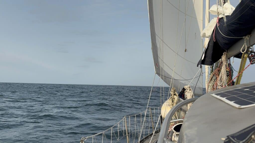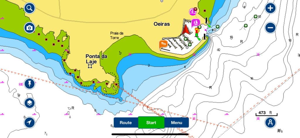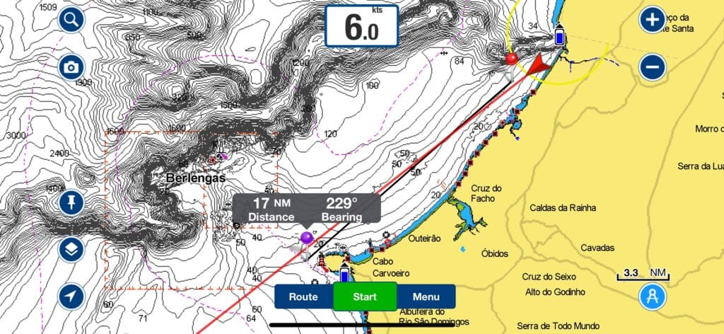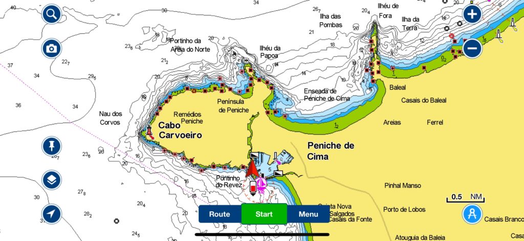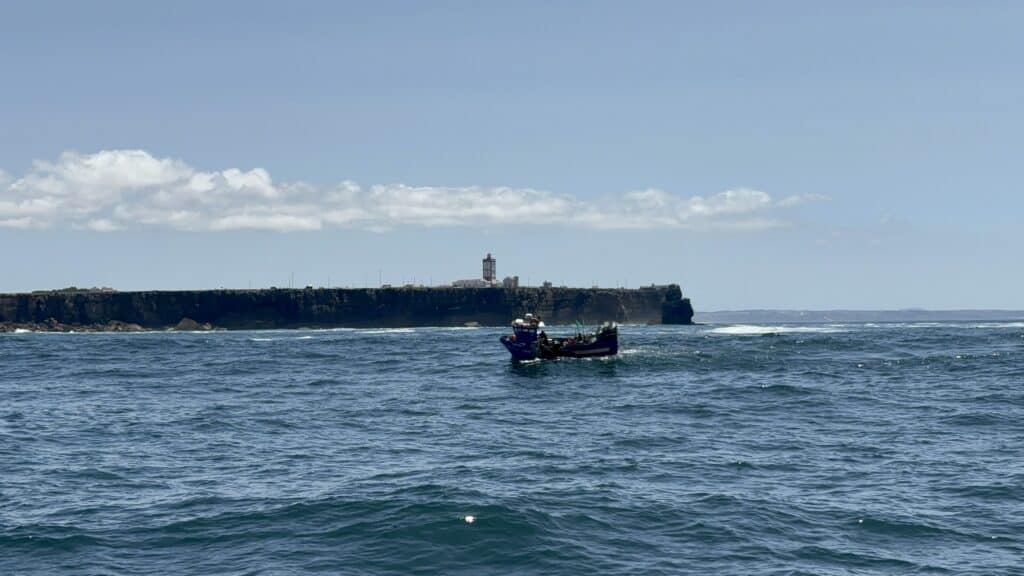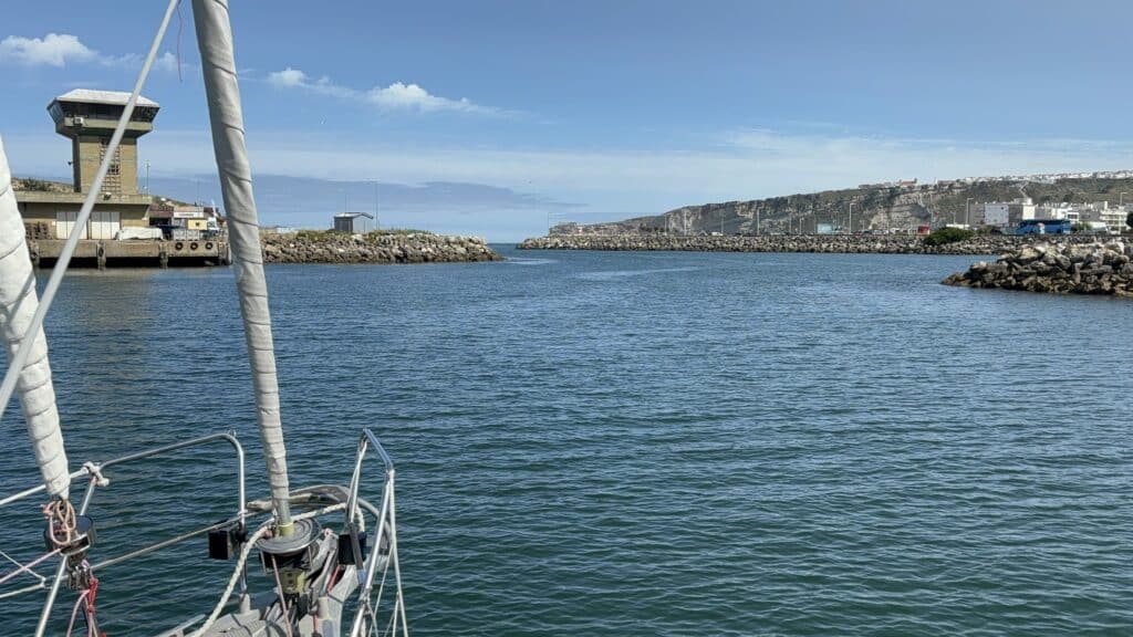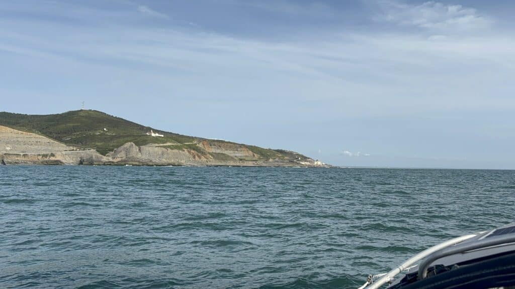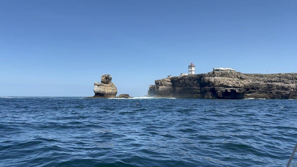 Den 6:e juni hade vi sovmorgon, dagens etapp var den kortaste på seglingen. Vi skulle bara drygt 20 NM till Peniche som låg runt västra udden på bukten. Hamnen i Nazaré har flera vågbrytare och när vi passerade de sista så möttes vi av dyningen. Vinden var mycket svag så vi motorseglade med revad stor för att minska rullningarna i dyningen och solen värmde från en blå himmel så vi kunde ta av oss våra jackor. Direkt när vi kom ut från hamnen kunde vi se udden vi skulle runda. Vi genade över bukten så Ikigai hamnade utanför 15-meterskurvan som vi dittills följt. För första gången sen Biscaya var vi på djupt vatten igen, men inte för så lång tid. På vägen upptäckte vi att även att Portugal har en skärgård, nåja några öar i alla fall. Ögruppen heter “Berlengas” och är ett naturskyddsområde med ett rikt fågel och djurliv, en fyr, ett kloster, ett fort och många forskare på besök. Peniche är närmsta samhälle till Berlengas så det går turistbåtar dit från staden, men det får bara vistas 550 personer samtidigt på ön.När vi rundade udden kunde vi se hur dyningen bröt mot klipporna, men inte bara där. Det var uppgrundningar utanför udden vilket gjorde att det bröt även ute i vattnet på några ställen och på andra grundområden var det fullt med fiskebåtar, så vi tog en vid sväng runt udden och fyren. Vi hade motorseglat hela sträckan utan att några problem så Ikigais Volvo Penta började åter etablera ett förtroende från sin besättning.