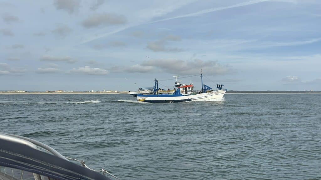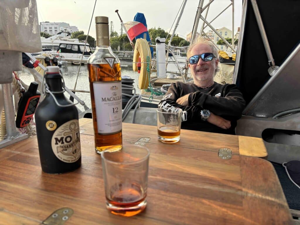 Efter vi passerat fyren “Mondego” på udden utanför Figueira da Foz kunde vi lova upp och segla in mot staden vars höghus syntes bakom en lång sandstrand. På vägen in mötte vi flera större fiskebåtar på väg ut och vi såg på kranarna inne i floden att det var en fiske- och industrihamn vi var på väg in till. Bakom vågbrytaren gick vi upp i vindögat och tog ner seglen och fortsatte för motor till den väl skyddade marinan på nordsidan av floden. Vi hade försökt att kontakta Figueira da Foz marina, men ingen hade svarat på varken VHF eller telefonen så vi antog att kontoret var stängt. Vi behövde fylla diesel så vi la oss vid bränslekajen. Vi hade inte legat där länge förrän en marinero kom ned och hjälpte oss fylla på bränsle och ge oss en plats i marinan. Det blev bara en middag och sen i koj för vi var ganska trötta efter att styrt två dagar på raken med 60 NM per dag. Men en ankardramm med fin whiskey från Skottland fick det bli innan sängdags, det var ju min födelsedag.