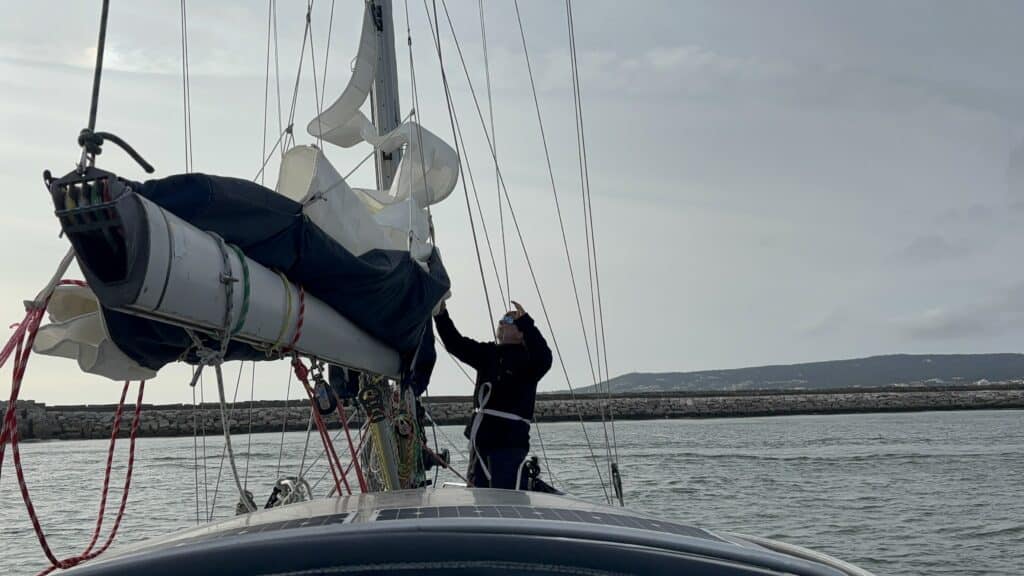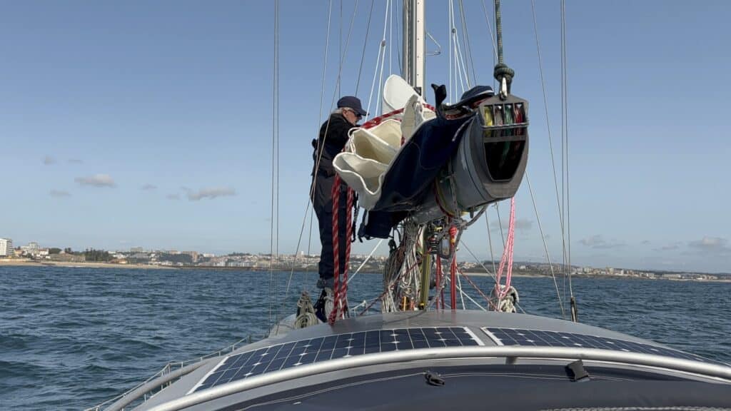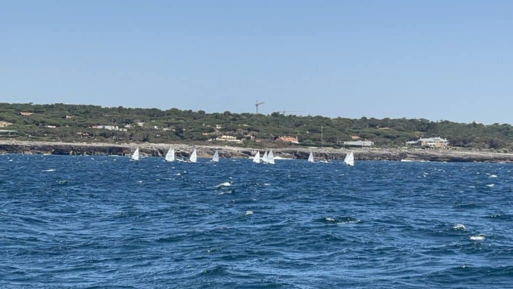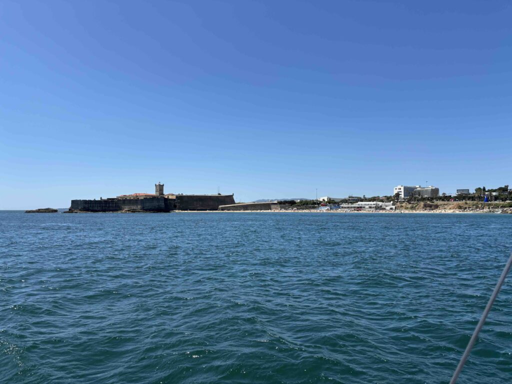 Följande dag, lördagen den 7 juni startade vi den sista etappen längs Portugals Atlantkust, till Lissabon, en sträcka på 60 distans. Och nu hade nordvinden ökat i stryka så det gick undan med revad stor och delvis utrullad genua. Efter en härlig segling rundade vi udden Cabo Raso och gippade för att lova upp mot inloppet till Lissabon. Vi passerade Cascai där det var kappsegling för lasers i den ganska grova sjön. Längre in var det optimister som var ute i lite lugnare vatten. Tompa hade bestämt att vi inte skulle lägga oss inne i Lissabon utan istället stanna i förorten Oieras som har en marina som har tågförbindelse med Lissabon. Det var en speciell känsla att komma fram till ett viktigt delmål efter en månads segling, inte helt utan problem. Här var det dags för mer båtfix, utforskning av Portugals huvudstad och väntan på fler i besättningen inför seglingen till Porto Santos och Madeira, men det blir del 4 i serien om segling med Ovni 385:an Ikigai till Madeira.