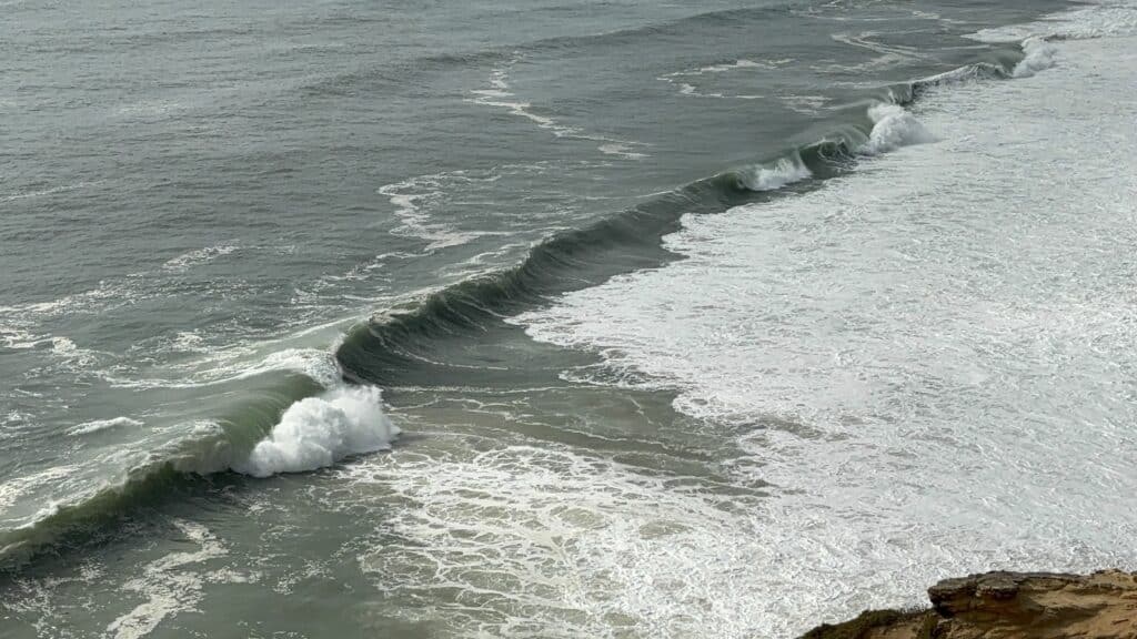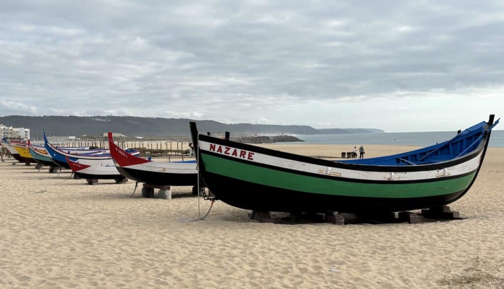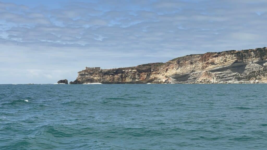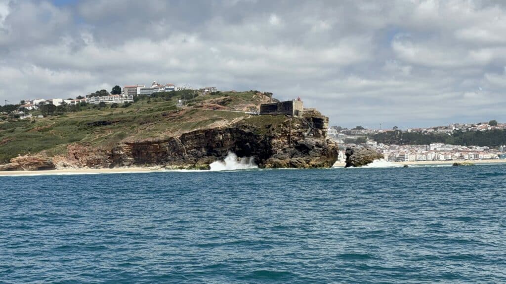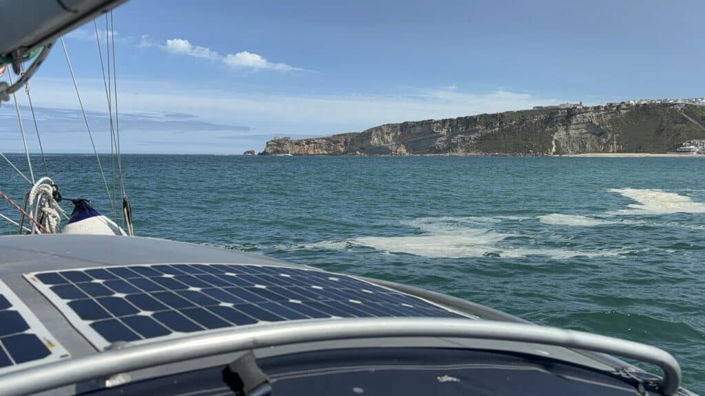 Vi startade tidigt den 5:e juni mot nästa mål på seglingen, Nazaré 35 NM bort. En för mig spännande plats då det är där surfarna riskerar livet i monstervågor. Orsaken är bottenförhållanden utanför udden där uppgrundningen är extrem och som gör att dyningen från fjärran stormar kan växa till över 25 meter när den bryter. På sjökortet kunde vi se att marinan ligger i den nedre delen av Nazaré i bukten bakom udden med den berömda fyren varifrån man kan se på när surfarna utmanar de brytande vågorna. Fyren står på en hög klippa och bakom ligger den övre delen av staden på en bergsplatå. En viss oro för hur dyningen skulle vara vid angöringen till marinan fanns vid avfärd med tanke på monstervågorna som kan bildas. Seglingen till Nazaré blev odramatisk i en svag nordlig vind om man bortser från alla fiskebåtar. Och även om dyningen var större än tidigare så var det inga problem att ta sin in mellan vågbrytarna till hamnen där marinan låg skyddad i lugnt vatten.