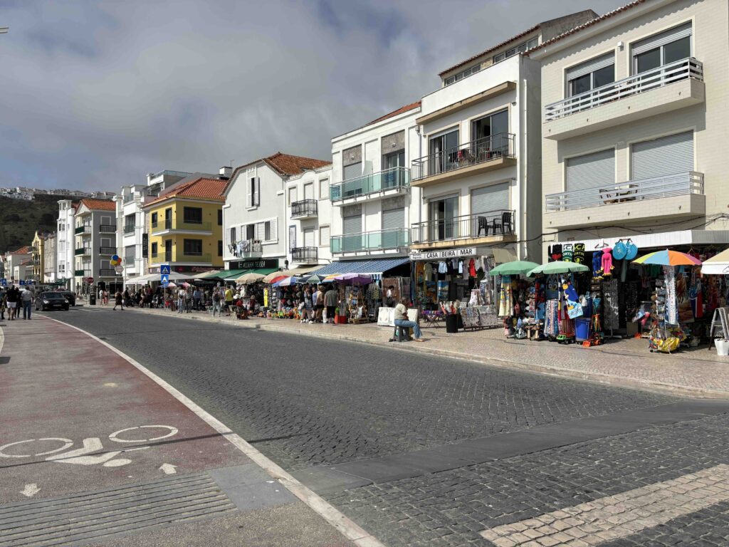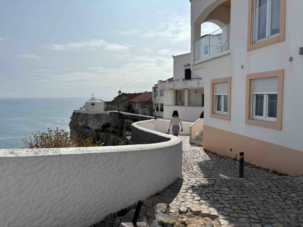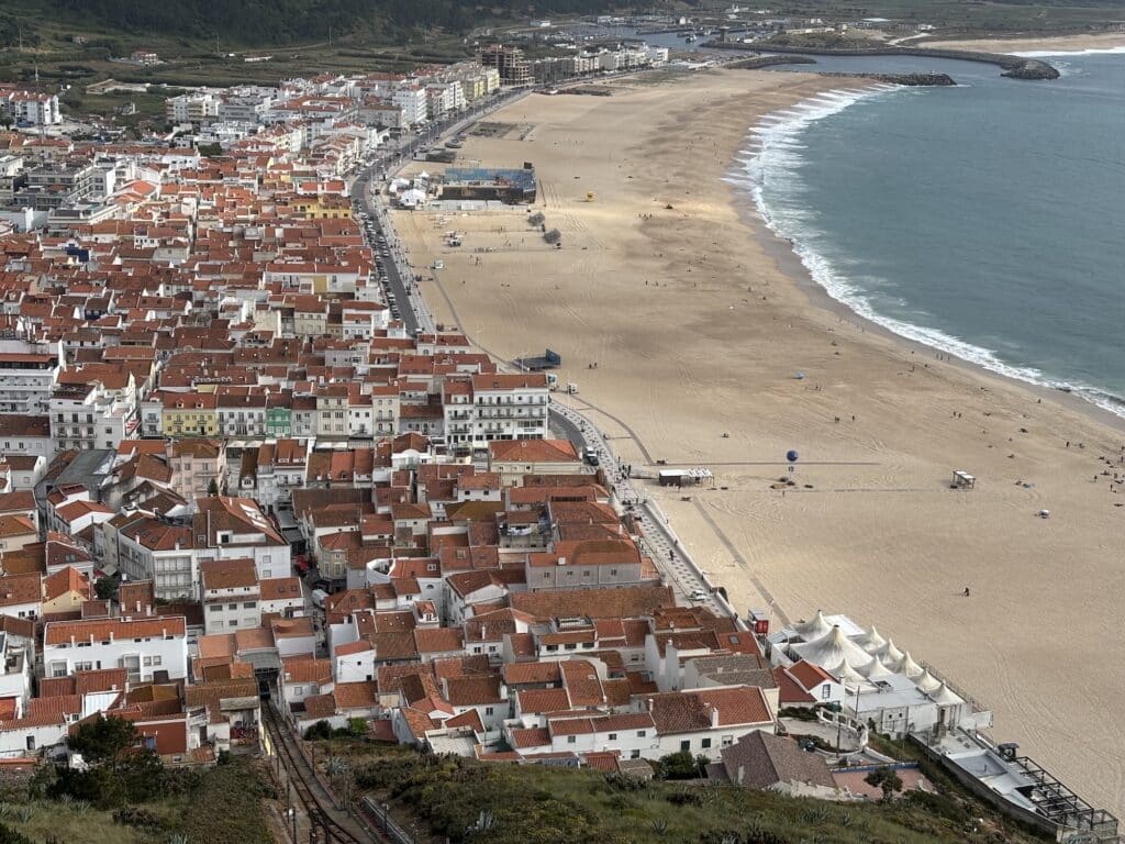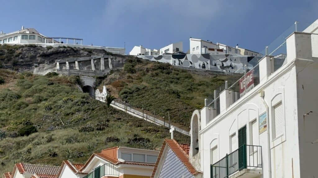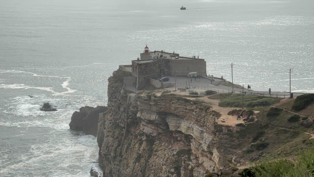 Man kan ta sig upp till Sitio med bil eller promenera på stigen som slingrar sig uppför branten eller ta bergsbanan vid bergets fot. Väl uppe på platån finns också en stad med kyrkor, gamla hus och turistaffärer, till och med ett pariserhjul. Men där har man också en spektakulär utsikt över stranden och staden nedanför med de röda tegeltaken och de vita husfasaderna, många prydda med mosaik. På vägen till fyren står en 6 meter hög staty av en man med hjorthuvud med en surfingbräda under armen, kallad “Veado” (hjort på portugisiska). Statyn knyter ihop en legend från 1200-talet som involverar en hjort med nutidens våghalsiga surfare. Man passerar också små pilformade skyltar med en fisk på som pekar mot klipporna. De visar på avsatser i berget där fiskare kan kasta ut sina drag ned i vattnet uppåt 100 meter nedanför, ett originellt sätt att fiska och att hissa upp fisken utan att den släpper måste vara en utmaning. Från fyren har man utsikt över stranden norr om udden, där surfvågorna skapas. Visserligen bröt den moderata dyningen mot stranden, men inte tillräckligt mycket för att locka några surfare, det var mest turister som hängde på stranden och som besökte fyren.