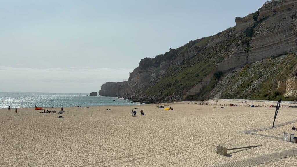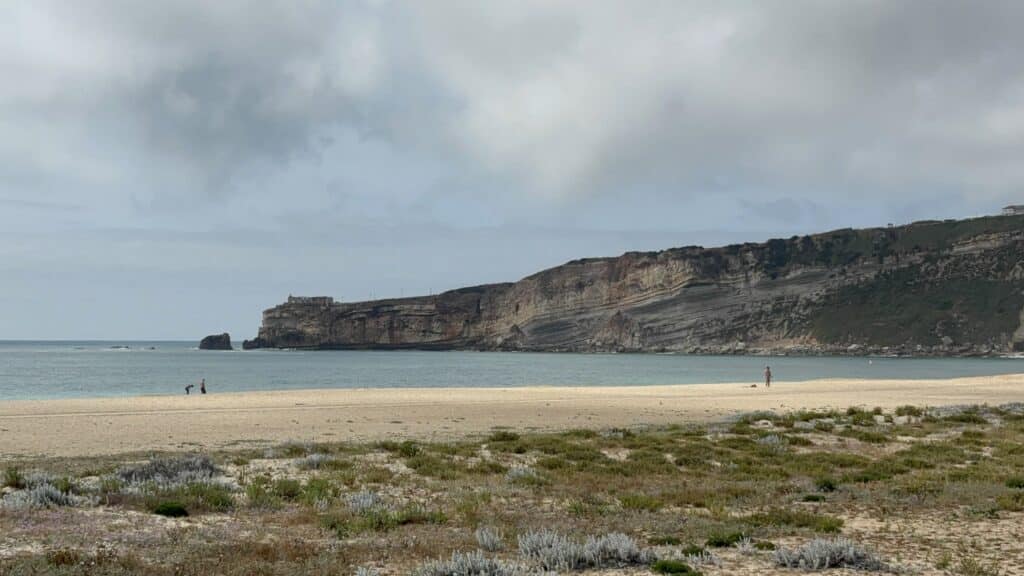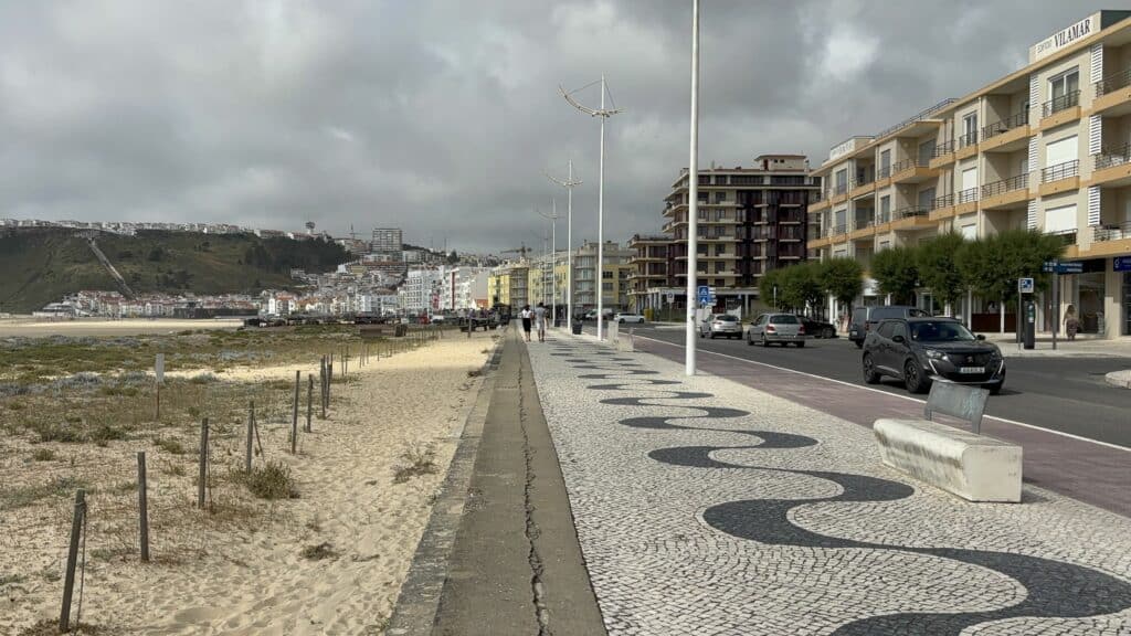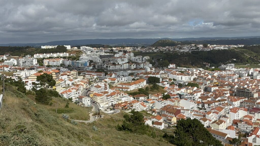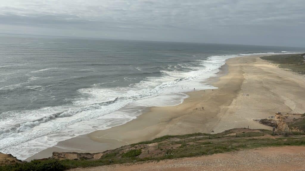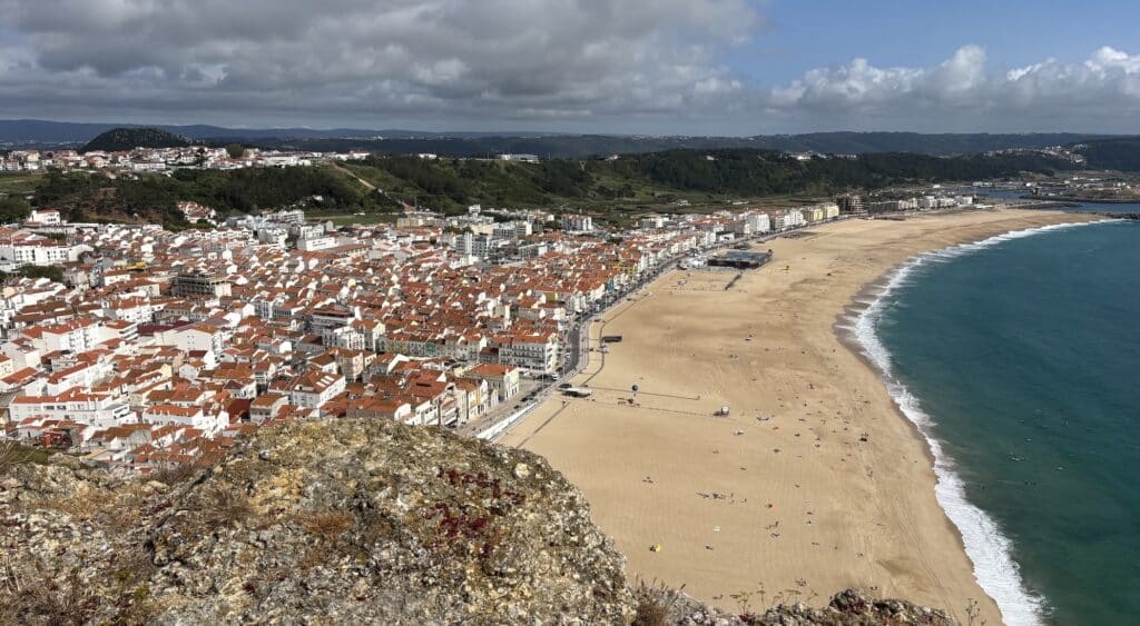 Man kan ta sig upp till Sitio med bil eller promenera på stigen som slingrar sig uppför branten eller ta bergsbanan vid bergets fot. Väl uppe på platån finns också en stad med kyrkor, gamla hus och turistaffärer, till och med ett pariserhjul. Men där har man också en spektakulär utsikt över stranden och staden nedanför med de röda tegeltaken och de vita husfasaderna, många prydda med mosaik. På vägen till fyren står en 6 meter hög staty av en man med hjorthuvud med en surfingbräda under armen, kallad “Veado” (hjort på portugisiska). Statyn knyter ihop en legend från 1200-talet som involverar en hjort med nutidens våghalsiga surfare. Man passerar också små pilformade skyltar med en fisk på som pekar mot klipporna. De visar på avsatser i berget där fiskare kan kasta ut sina drag ned i vattnet uppåt 100 meter nedanför, ett originellt sätt att fiska och att hissa upp fisken utan att den släpper måste vara en utmaning. Från fyren har man utsikt över stranden norr om udden, där surfvågorna skapas. Visserligen bröt den moderata dyningen mot stranden, men inte tillräckligt mycket för att locka några surfare, det var mest turister som hängde på stranden och som besökte fyren.